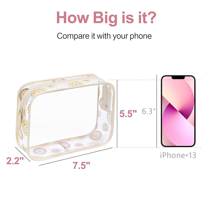 - High-Quality, Durable: The clear makeup bags keep the shape with reinforced boning. Smooth metal zipper for longevity, ensuring a secure seal that complies with TSA regulations for sealed bags. Wide opening for easy access. A net weight of only 0.7 lbs per bag, light and feelless