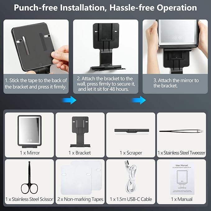 - Easy to Install: The shower shaving mirror package contains 2 pieces of Non-marking power tape, stick the double sided tape on the wall and the bracket respectively, and then hang the mirror on the bracket. The IP66 waterproof ensures that the mirror will not take on water when shower and will still work when splashed with water.