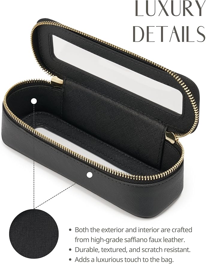 • [Premium Quality] - This clear small cosmetic case is crafted from high-grade saffiano faux leather, making it highly scratch-resistant, durable, and easy to clean. It features a smooth zipper for secure closure and elegant light gold metal accents for a luxurious touch.