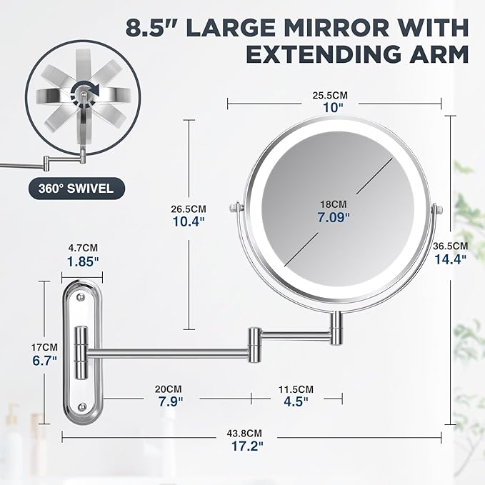 - 【Wall Mirror with Two Use Style】 This magnifying wall mounted mirror withextended arm has two usage modes. Storage Modes: lt fitting to the blankwall (10 x14.5 in) Extendeble arm mode size (14.5 x 17.5 in) This mirror facealso can be 360 "rotation to chose 1X or 15X.