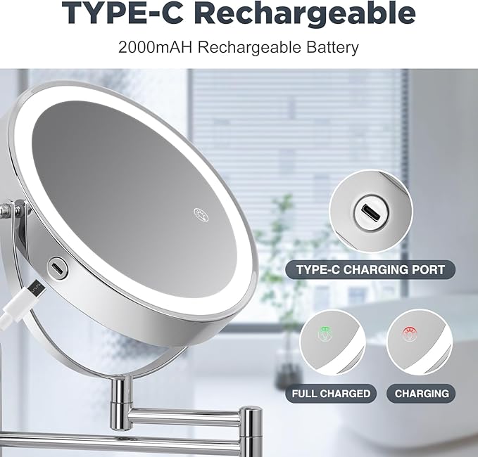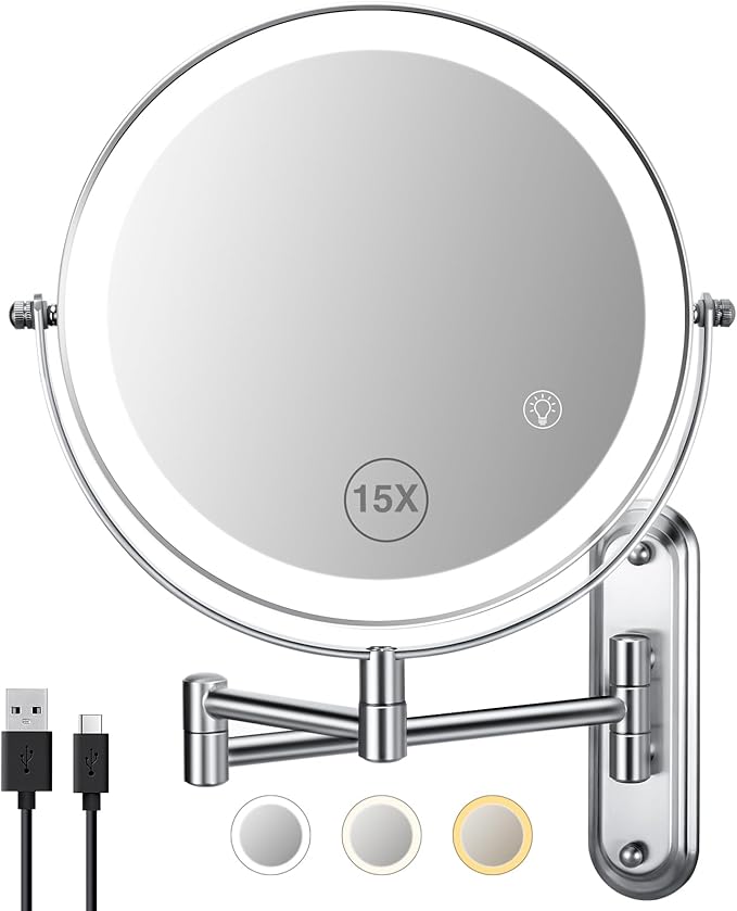 Wall Mounted Mirror with Lights - 15x Magnifing Extended Arm Mirror, 3 Color Lights & 360°Swivel Vanity Mirror, 8.5in Bathroom Mirrors for Wall Mounted - Chrome