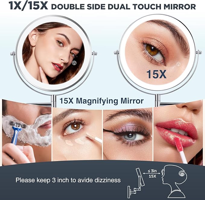 - Double Sided 1X/15X Magnifying Mirror】 This wall mounted makeup mirroris double sided with 1X and 15X magnification. The high definition 1Xmakeup mirror for your overall facial makeup, while the 15X magnificationmirror ensures every detail of your face is flawless. Please keep 3 inchdistance when use the 15x magnifying mirror to avoid dizzy.