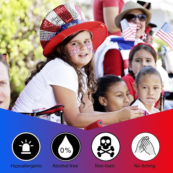 - PATRIOTIC FACE GLITTER --- Our 4th of July Red White Blue Glitter used on face or body to express the spirit of patriotism for your country. USA Flag body glitter gel contains net 36g/pack.Large number of holographic sequins,mixing with fine and chunky glitter, the color and shine of of the laser sequins vary with the perspective, like a rainbow
