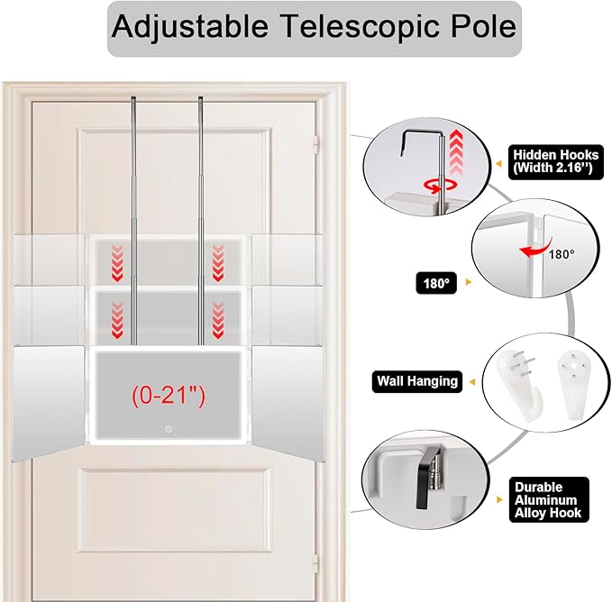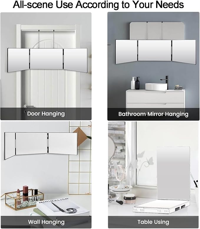 - MADE TO LAST, HANDS FREE - Thanks to its strong adjustable brackets, all you need is a door to position our trifold mirror at the perfect height. *Note* Please peeling the protective film off before using.