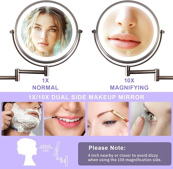 - 【Double-Sided 1x/10x Magnifying Makeup Mirror】: This lighted makeup mirror have two sides – 1X for a regular view to see the whole face, and 10X magnification for detailed tasks like applying eye makeup, putting in contact lenses, or dealing with blemishes. Attention: The 10X magnification is very powerful, for the clear view, it is recommended to keep a distance of 4 inches/10 cm while using.