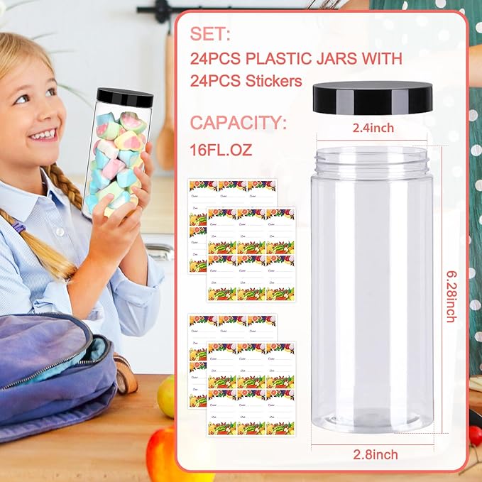 Plastic Jars with Lids 16 oz 24Pack,Empty Clear Plastic Jars with Lids for Storage, Round Leakproof Containers for Nuts,Cookies,Dried Fruit,Small Snacks(16fl.oz,set of 24)