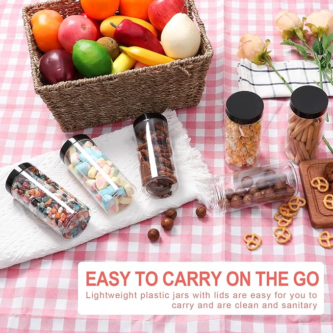 - WIELY APPLICATION:These clear plastic jars with lids are perfect for storing nuts,cookies,dried fruit,etc.It widely used in kitchen storage for spices or dry goods.Also great for organizing arts & crafts supplies like buttons,party favors,bath salts and jewelry,etc