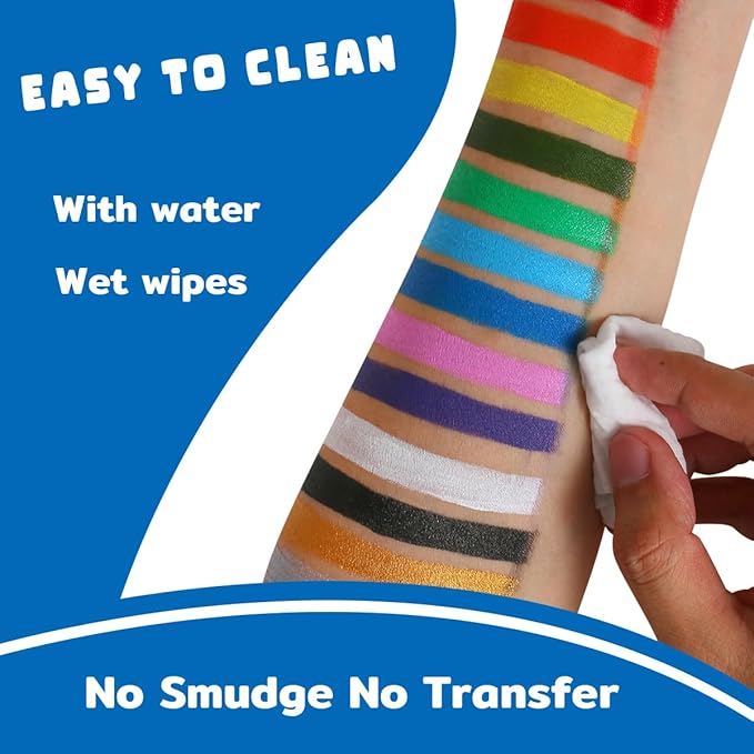 - Easy on and off : The creamy paints are easy to blend on the skin with brush, sponge or finger.You can easy wash off with water or wet wipes,not even with soap.