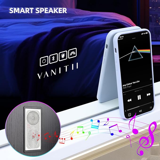 - RGB BACKLIT & 3 COLOR FRONTLIT - Equipped with full-spectrum RGB light strip, the speaker mirror can be transformed from static color to dynamic RGB color smoothly, creating party atmosphere lighting for your room. The front light of the mirror for desk can be changed from 3 color temperature to fit your different makeup needs.