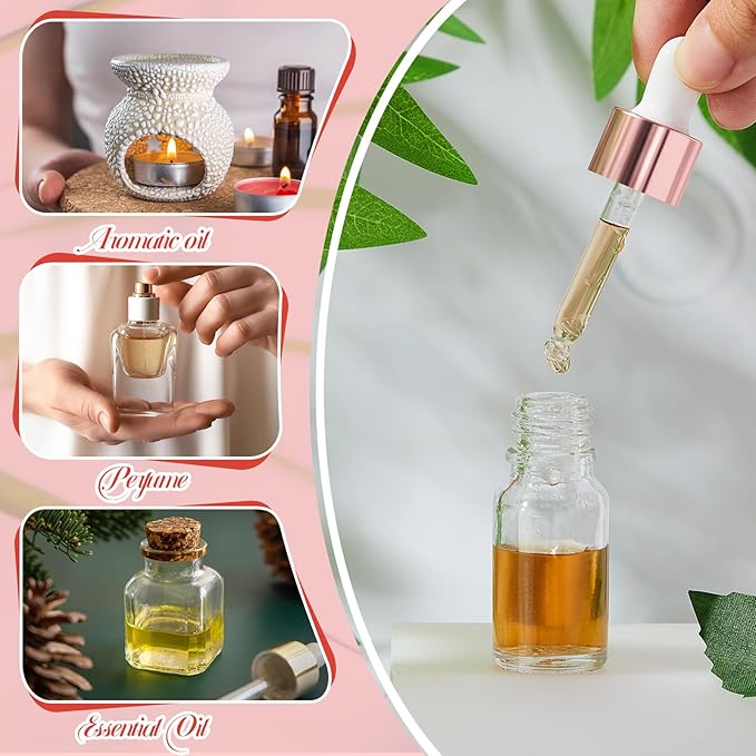 100 Pcs Mini Glass Oil Dropper Bottle Bulk, Clear Essential Small Empty Bottles Sample Containers Perfume Liquid Vials with Cap for Traveling (10 ml,Rose Gold)