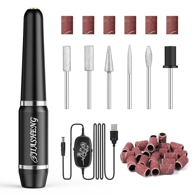JIASHENG USB Electric Nail Drill, Portable File for Acrylic Gel Nails, Professional Manicure and Pedicure Kit With Drill Bits for Home and Salon Use, Black