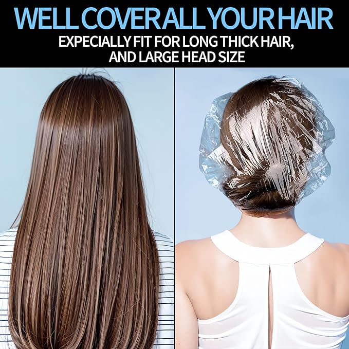 - Multipurpose Shower Caps: Fantastic large disposable shower caps for women, men, girl. Perfect plastic caps for hair treatment, hair deep conditioning, hair dyeing. Organize and protect your hair when doing face care, spa, salon, having spray tan, cooking, cleaning house, painting wall. Ideal guest supplies for hotel, beauty salon, workshop. Also great choice for covering food like fruit and dough, shoes, hat, bicycle seat, remote control, and so on.
