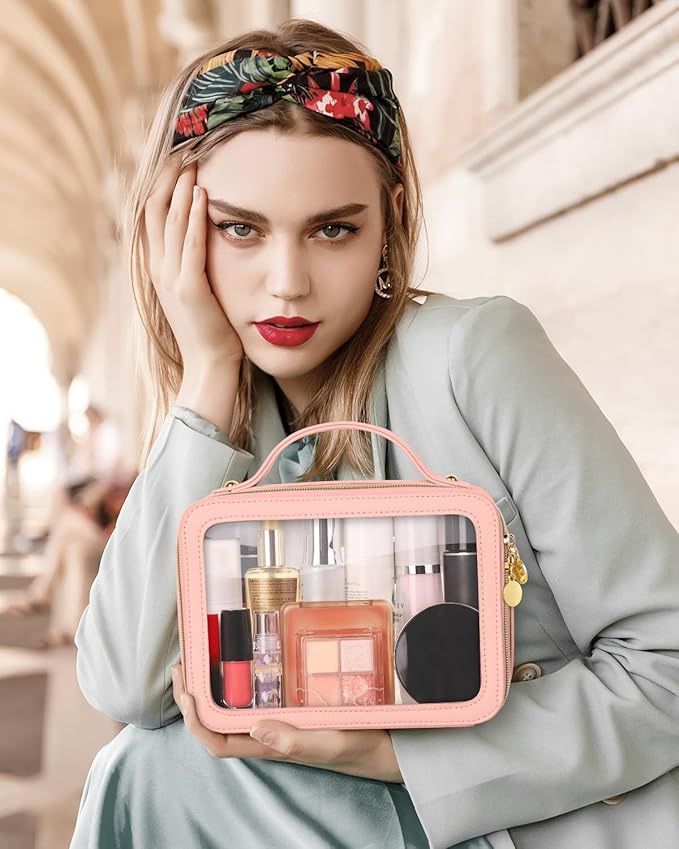 Clear Makeup Bag, Portable Travel Cosmetic Bags, Multipurpose Leather Toiletry Bag with Zipper, Waterproof Transparent Cosmetic Organizer for Women, Medium, Pink