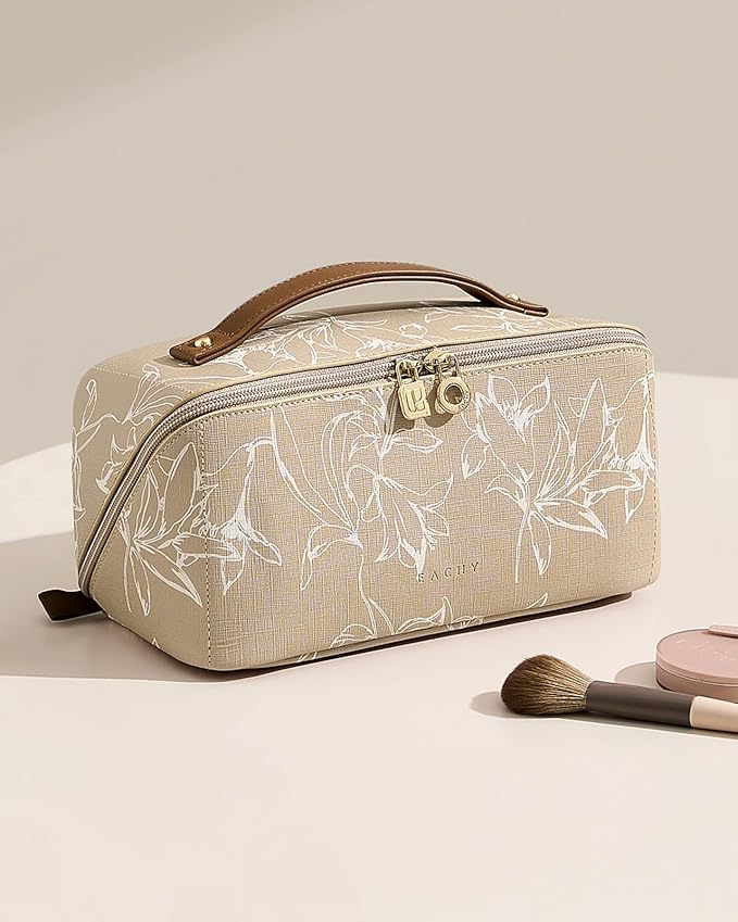 EACHY Travel Makeup Bag, Large Capacity Cosmetic Bags for Women, Waterproof Portable Pouch Open Flat Toiletry Bag Pattern Makeup Bag (F-Brown)