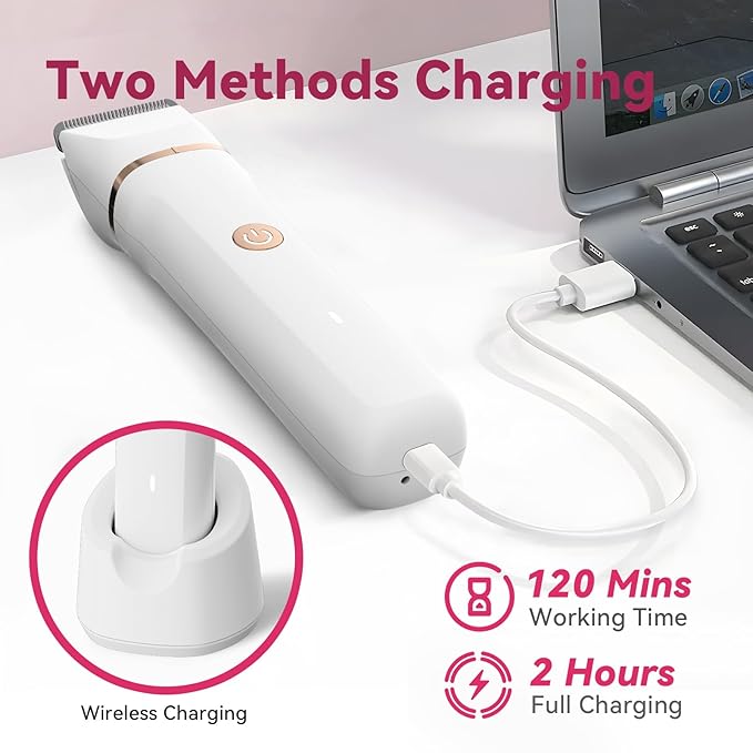 - LONG LASTING AND RECHARGEABLE: This cordless pubic hair trimmer is rechargeable and comes with a USB cable, carrying bag and a dock. The high-performance lithium battery provides longer life, with up to 90 minutes of battery life on a full charge, bikini trimmer is enough to meet the needs of shaving while traveling. This electric razors for women features a noiseless design for a pleasant hair trimming experience