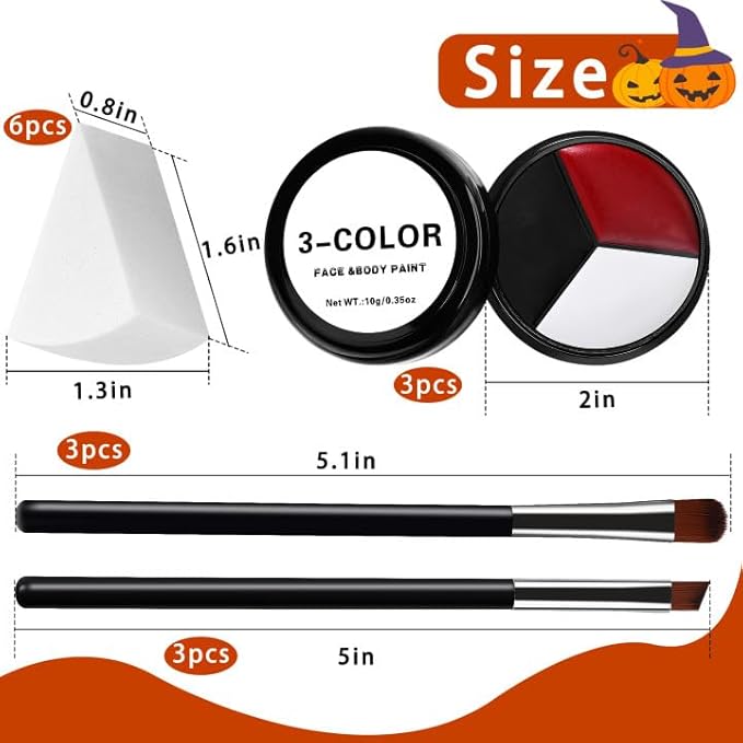 - Package Contains: Considering your needs,we provide you with 3pcs clown face paint,6pcs brush,6pcs triangle powder puff.It will fully meet your needs,so you do not need to be disappointed for the lack of makeup accessories.Brushes outline details and powder puffs complete face makeup.
