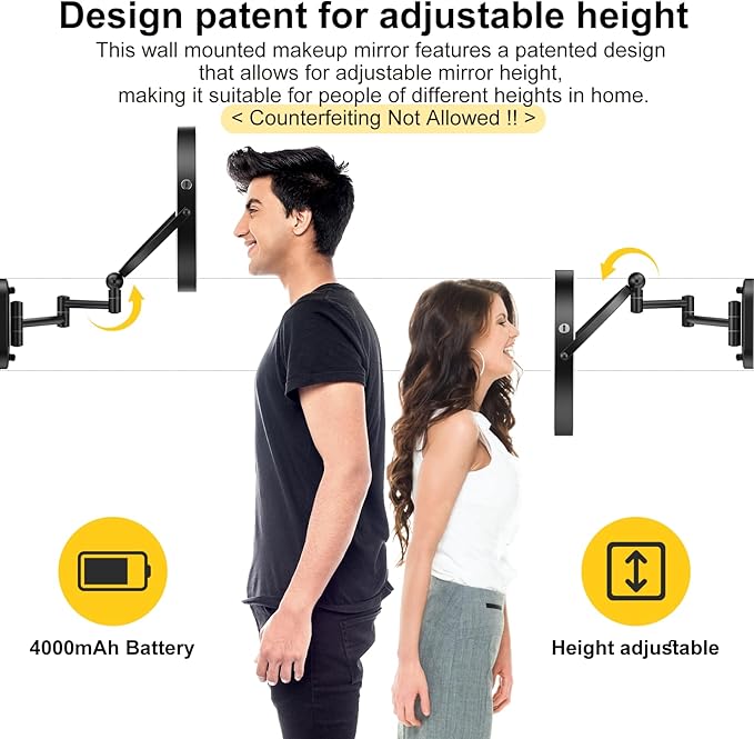 • Ajustable Brightness & 3 Colors Lighting: The light up mirror has 3 different lighting settings, including white light(7000K), natural light(5000K) and warm light(3000K) to help you get the ideal light for your makeup or read application. The stepless dimming feature allows you to adjust the brightness to your desired level, while the smart touch control makes it easy to switch between different lighting modes. This innovative lighted vanity mirror is the perfect addition to your beauty arsenal.This wall-mounted makeup mirror adopts a patented design with adjustable height. Counterfeiting will be prosecuted!