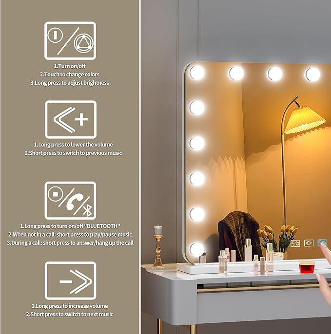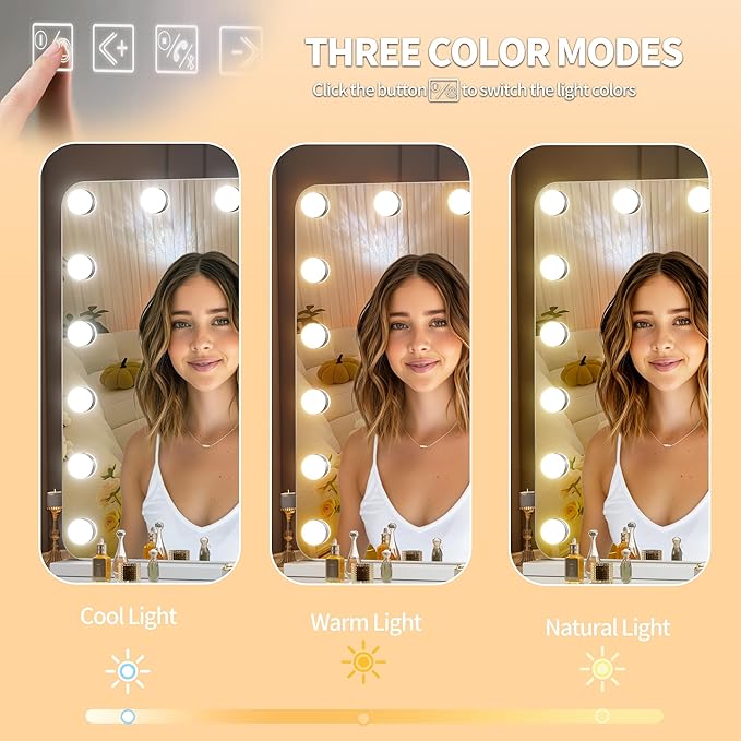 - ๐ใ๐ฆ๐บ๐ฎ๐ฟ๐ ๐ง๐ผ๐๐ฐ๐ต & ๐ฏ ๐๐ผ๐น๐ผ๐ฟ ๐ ๐ผ๐ฑ๐ฒ๐ใThis makeup mirror not only can adjust the brightness of the light, but also has three light colors to choose from, which fully meets the needs of different occasions of make-up; the three light colors are: warm light, natural light, and cold light.