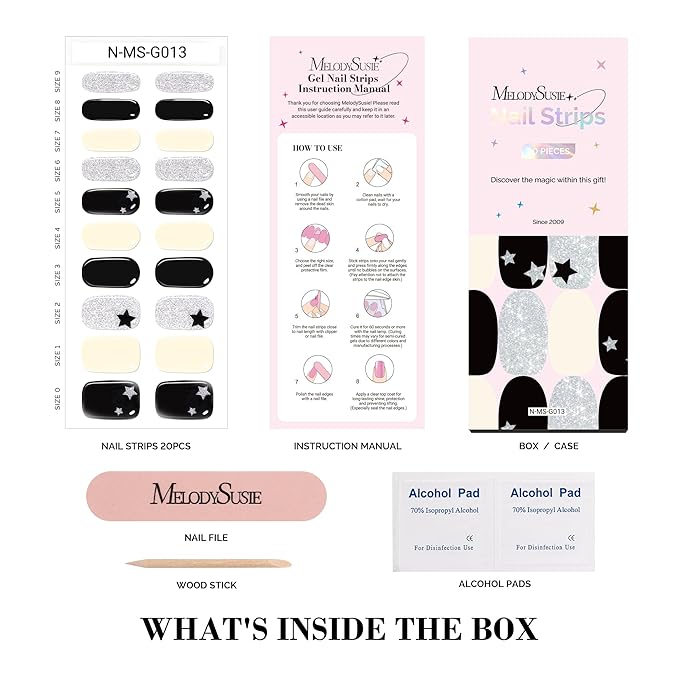 - Exclusive Design: MelodySusie's gel nail strips designs for any occasion (shopping, dating, friends gathering, wedding, gifts, Christmas or simply at home). Nail strips ranging from solid colors and french tips to glitter and patterned designs, MelodySusie has the perfect semi cured gel nails style for every occasion.
