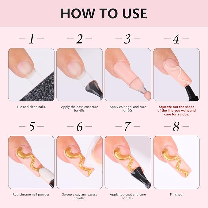 - Easy to Control: Makartt 3D gel is user-friendly and easy to apply. No need extra tool, just squeeze the tube to create your desired designs. Super fine powder, easy to apply; To get the best nail effect, need base coat and no wipe top coat. This chrome nail kit also good for beginners, just follow the instructions and you'll get it done.