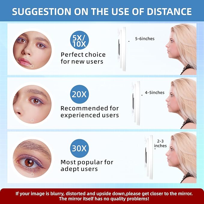 - 【Shopping Notice】If it’s your FIRST TIME to use a magnifying mirror, please be sure to read the following before purchase. 20x magnification is a concave mirror, you need to get VERY CLOSE to the mirror and focus on the MIDDLE AREA of it, otherwise, you will feel distorted or upside down. So it not suitable for those who want to see the whole face when makeup. PLEASE BUY WITH CAUTION.