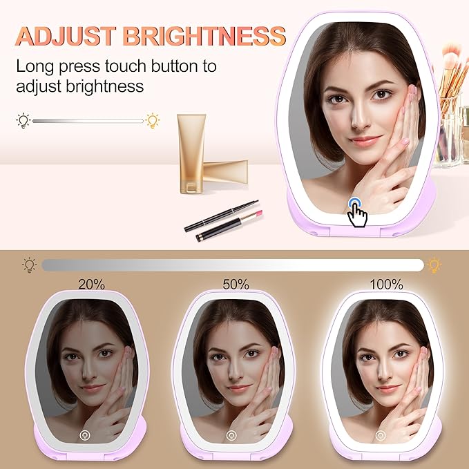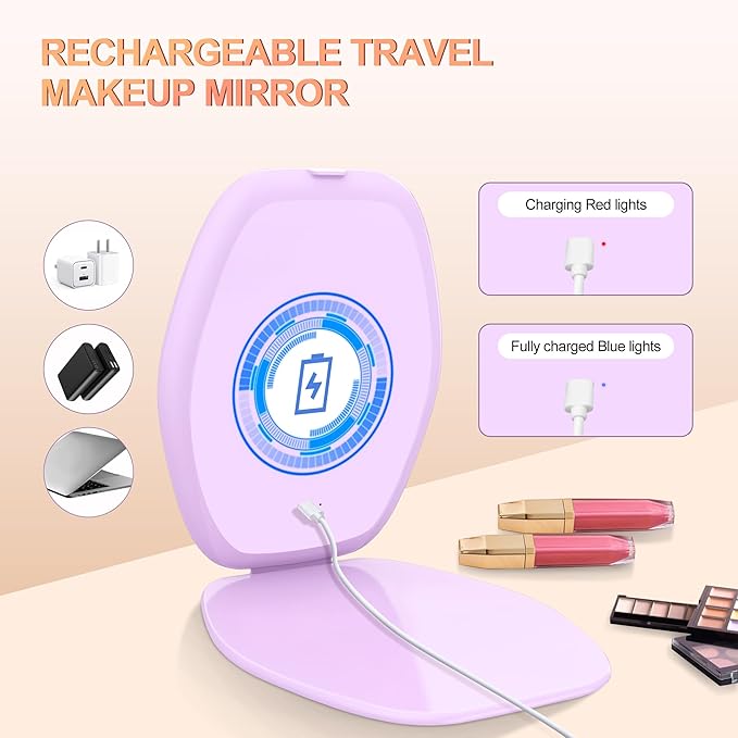 Travel Makeup Mirror with Light: 3 Color Lighting Portable Mirror with Touch Screen Rechargeable Adjustable LED Lights Hexagon Vanity Mirror for Travel, Desk, Home (Purple)