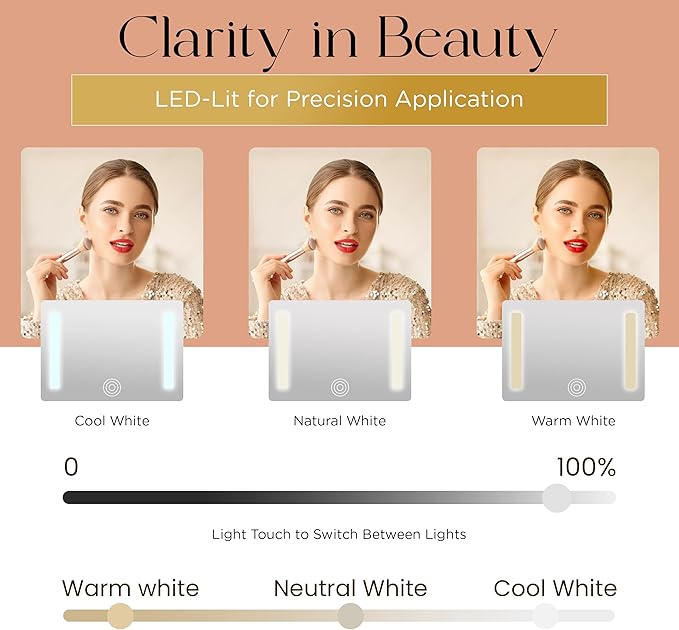 - [4k HIGH-DEFINITION 12.5'' LARGE MIRROR AND 3 SETTING LIGHT SYSTEM] - Our Large 12.5 inches lighted makeup Mirror with advance lighting system will give every time full view and perfect illumination while eliminating shadows by evenly distributing light over the face so you will never miss any spot. Our makeup box with lighted mirror features 3 light settings - daylight, warm light and cool white light, you can adjust as your liking with short touch of a button - And adjustable brightness with long press , allowing you to apply makeup in the best lighting conditions for a flawless finish