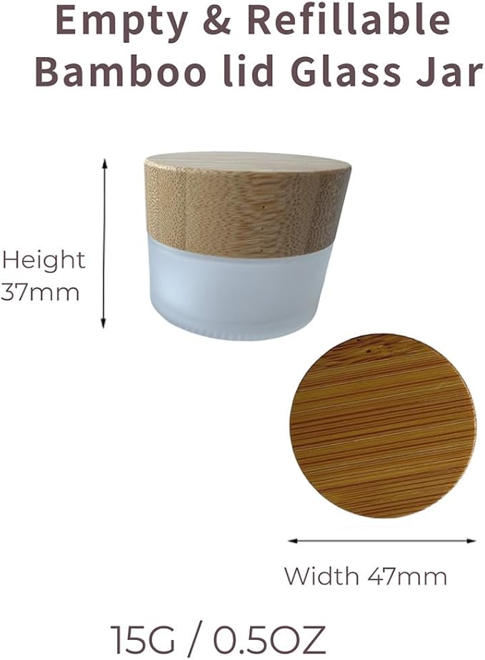 - 【PRACTICAL COSMETIC CONTAINERS JAR】The cosmetic jars are made by glass and natural bamboo lid.Capacity:15G/0.5oz. The set comes with a set of 4 pcs 10g cream jar for cosmetic storage,The material is of luxury glass with wide mouth for storing and dispensing creams, eye creams, lip balms, ointments, DIY skin care products, etc.Mini travel size as toiletries containers for skin care products.