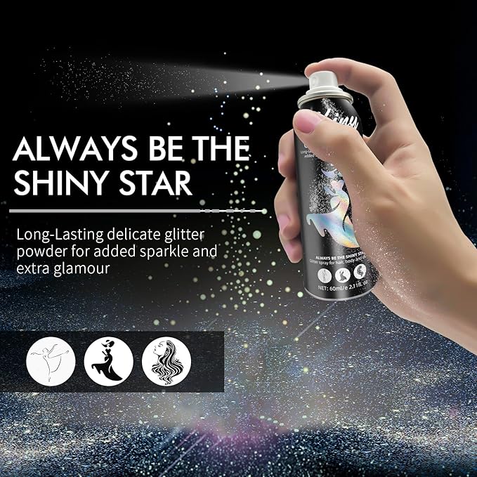 - Easy to Use: Our user-friendly formula simplifies application: Shake, spray 20-30cm from hair, body, or clothes, then wait 60 seconds. The fine mist of glitter effortlessly adheres, guaranteeing long-lasting sparkle with minimal effort. Enjoy effortless glamour in moments!
