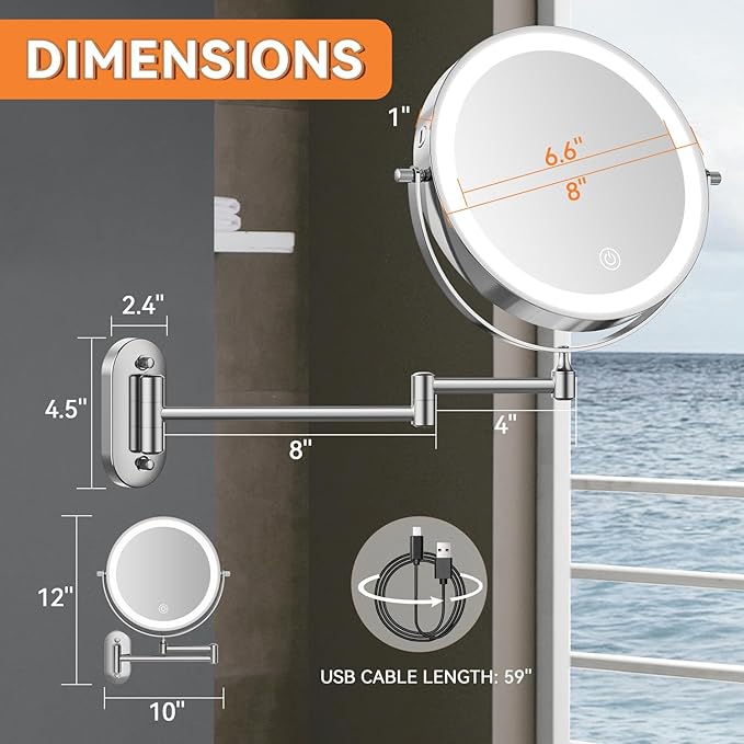 1X/20X Wall Mounted Makeup Mirror with Light, 8" Rechargeable Double-Sided Magnifying Mirror, Vanity Mirror Dimmable 3 Color Light, 360ยฐ Extension Rotation Foldable 14.5 Inch Arm, Chrome