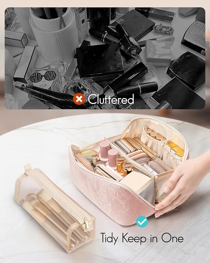 - Roomy & Portable: 9.1 x 4.8 x 4.7 inches (0.53lbs) offers ample space for cosmetics, brushes, and toiletries. Maximizes storage without cluttering luggage—ideal for travel,daily cosmetic organizer