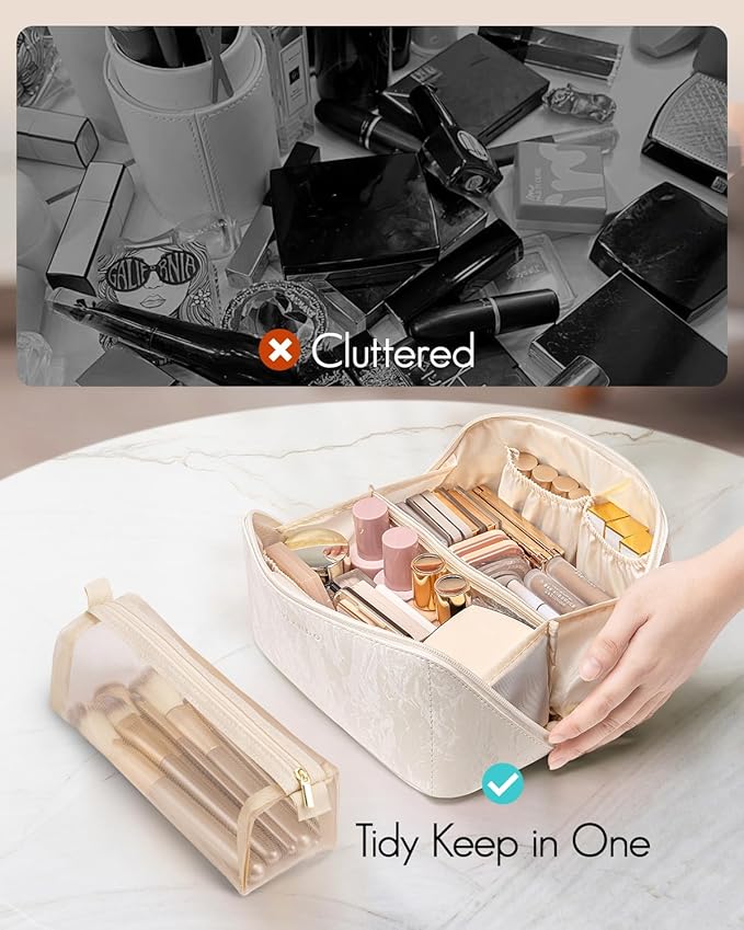 - Multiple Compartments: 2 large sections + 3 elastic pockets organize makeup/skincare. Middle zippered TPU pocket for small items; extra brush pouch keeps tools tidy and visible