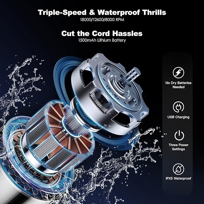 - 【Triple-Speed & Waterproof Thrills & Self-Balancing Stability】Choose from three speed settings—18000, 12600, and 8000 RPM. Customize your clean from gentle to turbo with our high-quality motor, and enjoy the confidence of IPX5 waterproof protection. The handle and clamp head adjust for self-balancing during spinning to ensure stability. If you feel significant vibration, try gripping the handle firmly to assist in balancing. For best results, insert the clamp head into the handle and the brush into the clamp head as vertically as possible.