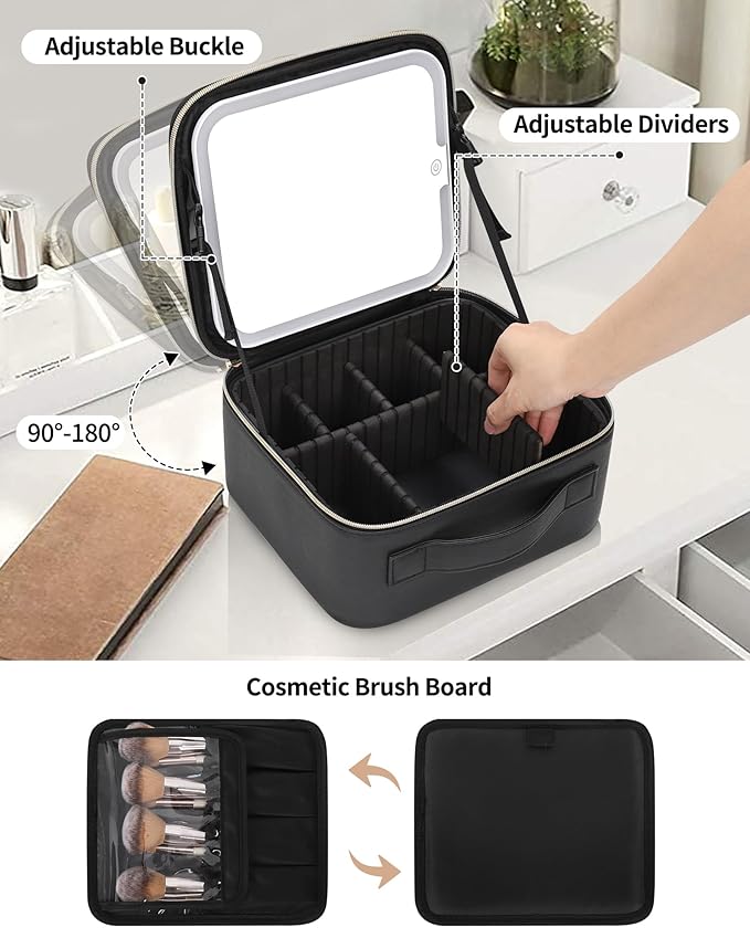 Makeup Bag With LED Mirror, Travel Makeup Case with Light up Mirror Large Cosmetic Case with 3 Color Lighted Portable Organizer Bag with Adjustable Dividers(Black)