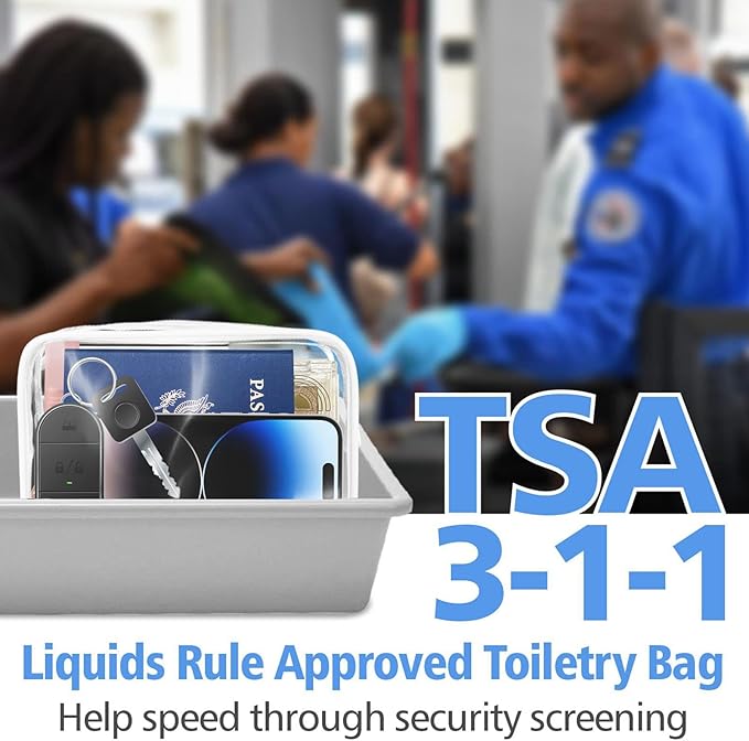 - TSA APPROVED TOILETRY BAG: The TSA certified clear toiletry bag strictly follow 3-1-1 airport regulations, so you don't have to worry about getting through airport security. Clearly see-through to quickly spot whatever you need and pass the security without opening the toiletry bags.
