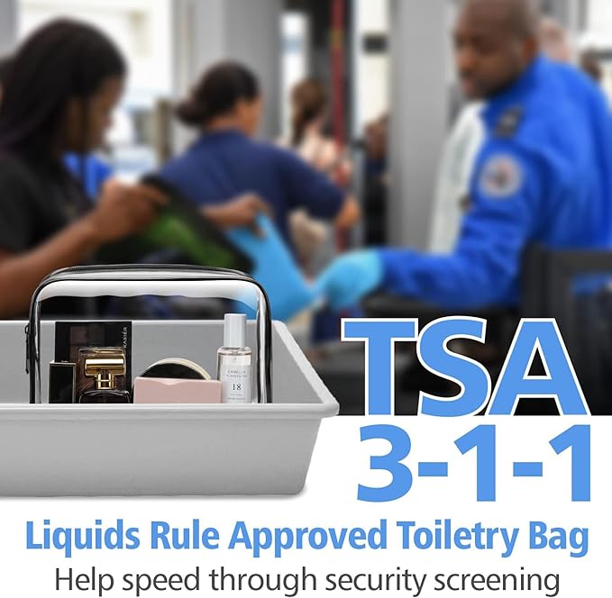 - TSA APPROVED TOILETRY BAG: The TSA certified clear toiletry bag strictly follow 3-1-1 airport regulations, so you don't have to worry about getting through airport security. Clearly see-through to quickly spot whatever you need and pass the security without opening the cosmetic bags.
