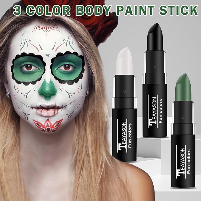 3 Colors Face Body Paint Sticks Professional Eye Black Football Baseball Softball,Highly Pigmented Halloween Facepaint Makeup Kit for Adults and Kids(White/Black/Green Eye Black Sticks)