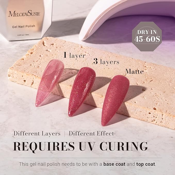 - FASTER CURING: This is UV gel. It must be used with UV light, a base coat and top coat! Cured with UV LED light in 45-60 secs, without shrinking or unevenness.With proper application, last at least 3 weeks.
