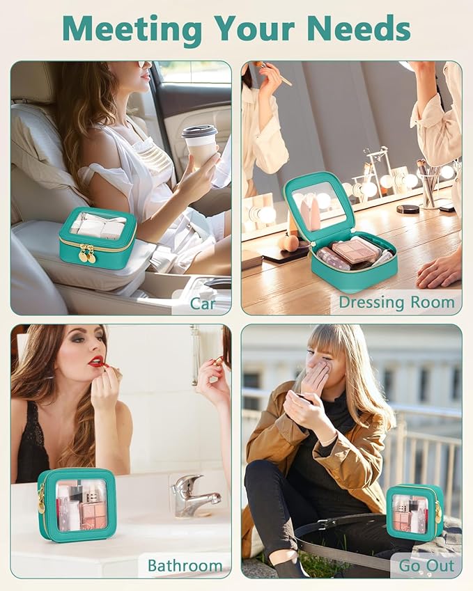 Mini Makeup Bag, Small Makeup Bag for Purse, Waterproof Clear Makeup bag, Leather Cosmetic Bag, Square Make Up Bag Pouch, Toiletry Bag for Travel, Car and Women, Green