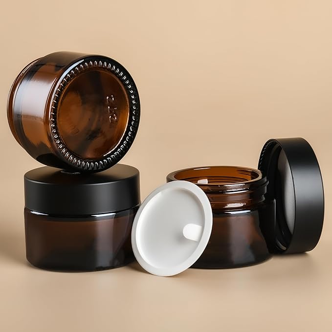 1 oz Reusable Amber Glass Container Jars 24 Pack with Wide-mouth Leak Proof Cap and Inner Pull-On Lid for Travel Storage Makeup, Face Creams, Body Lotions, DIY Crafts or Others