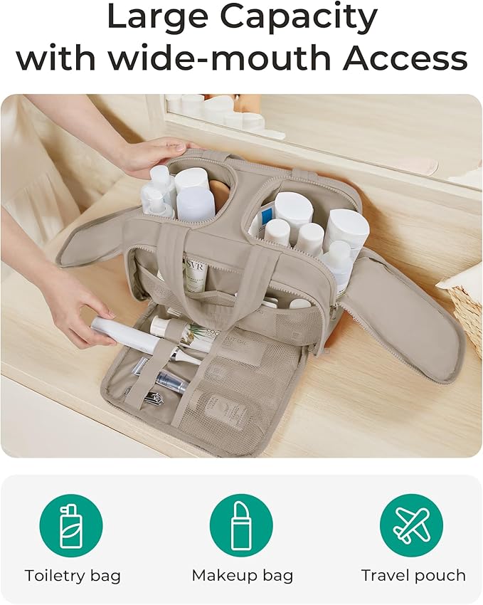 - Easy Access and Keep Upright : Full opening and not piling up for easy access to items. Double side full open design of travel bag for toiletries keeps cosmetic bottles and toiletries can stand upright in the middle compartment. Avoid leakage during transit