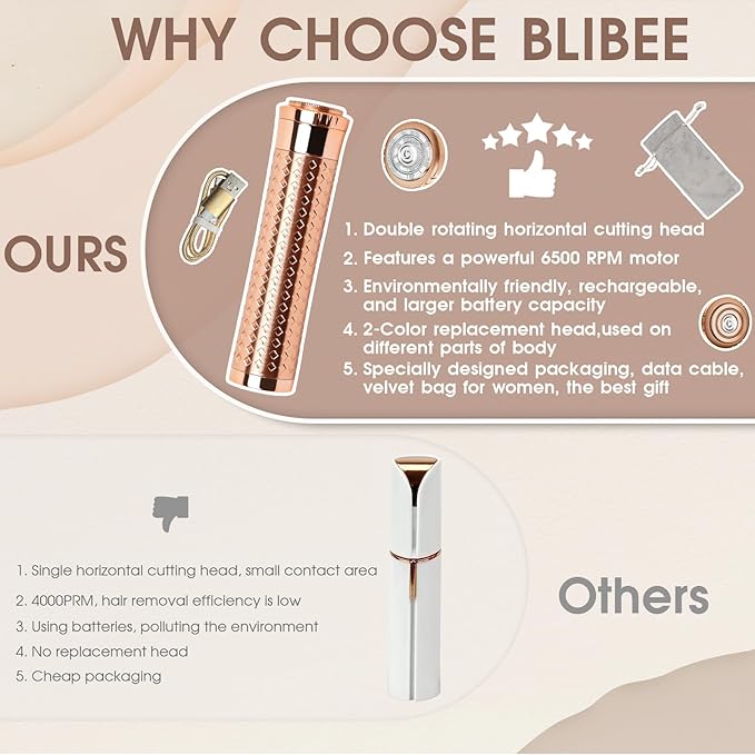 - 2-Color Replacement Head: BLIBEE facial hair removal for women offers two different color replacement heads—fashionable silver and rose gold—that can be used on different parts of your body for enhanced cleanliness and hygiene