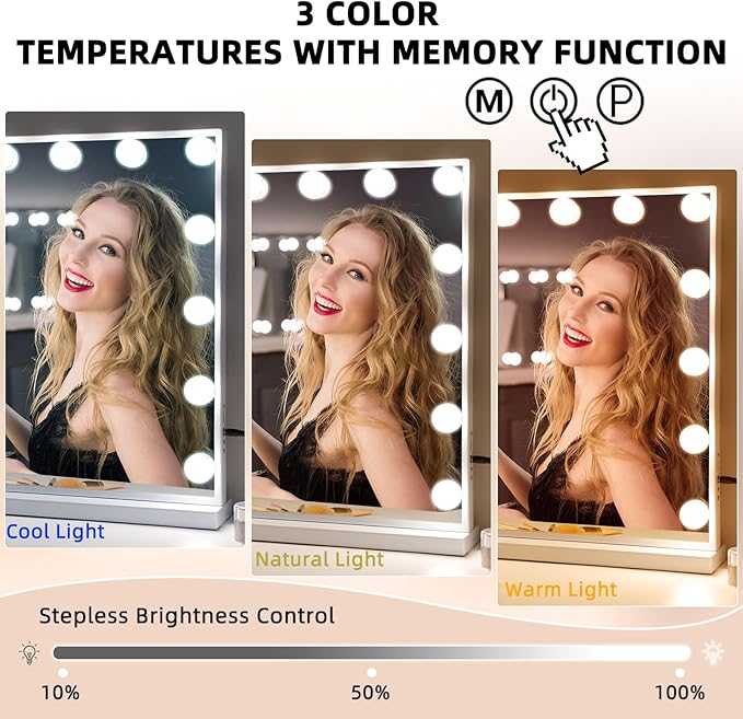- Upgraded Adjustable Brightness & 3 Colors Light :There are 15 LED bulbs around the lighting vanity mirror,The brightness can be adjusted to meet your personal makeup needs,protecting your eyes.3 colors light to meet the makeup needs of different occasions, Note: The LED bulb is embedded and cannot be adjusted or replaced.