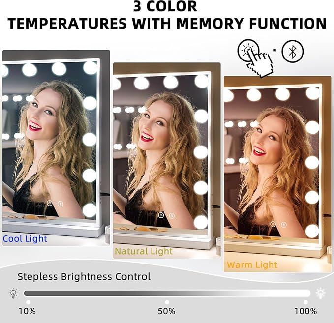 - Upgraded Adjustable Brightness & 3 Colors Light :There are 15 LED bulbs around the lighting vanity mirror,The brightness can be adjusted to meet your personal makeup needs,protecting your eyes.3 colors light to meet the makeup needs of different occasions, Note: The LED bulb is embedded and cannot be adjusted or replaced.