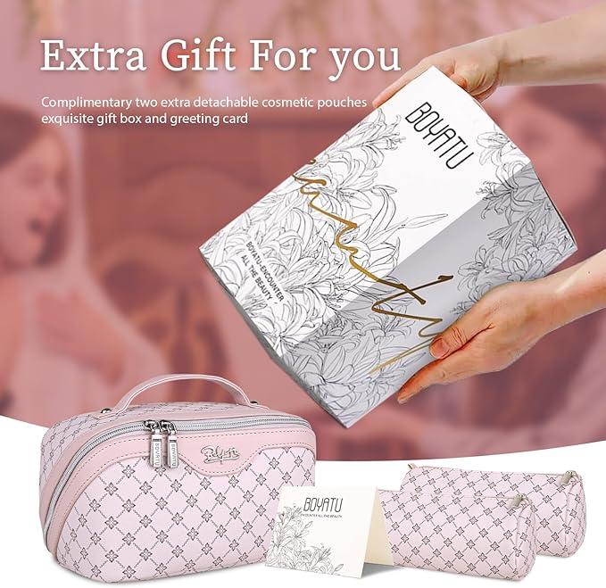 - Exquisite packaging: This travel make up bags for women comes beautifully packaged in an exquisite gift box, with a thoughtfully designed greeting card. It will be a great gift for ladies on Valentine's Day, Mother's Day, Birthdays, Christmas,Thanksgiving Day, Anniversary Day and more.