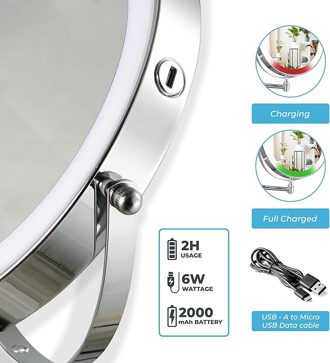 - Rechargeable Convenience: This wall mounted makeup mirror is rechargeable, offering you the flexibility of cordless use. This lighted bathroom mirrors is wall mounted and ensures your makeup routine is never interrupted by power issues.