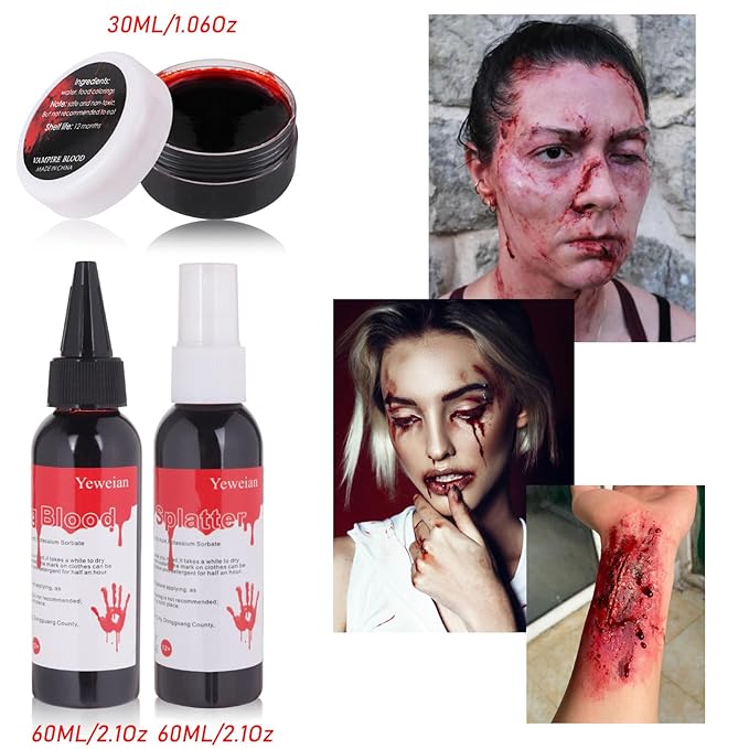 - Safe Ingredients, Suitable for All Skin Types: Our fake blood products are made from safe, non-toxic and non-irritating ingredients, no harm to the skin, ultra-realistic. You can spray or smear it on body face, arms and legs, perfect for fake blood makeup, cuts, scars and even wounds! Not recommended for children