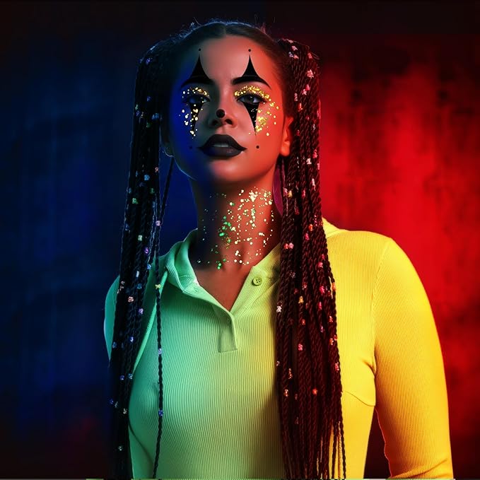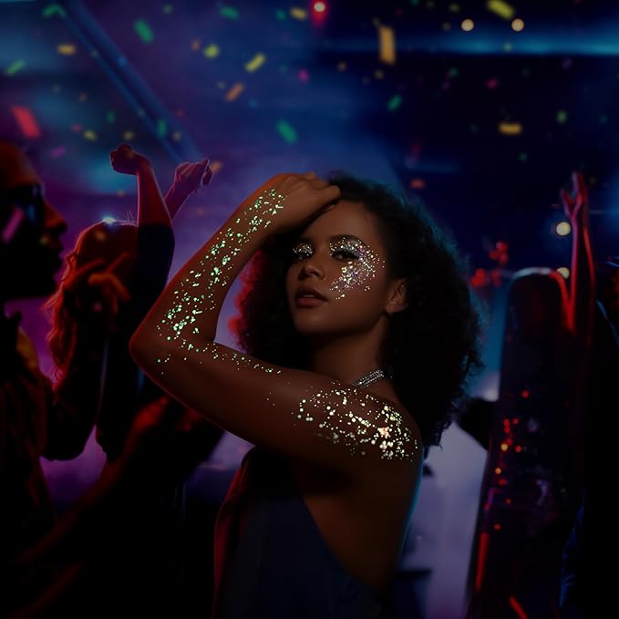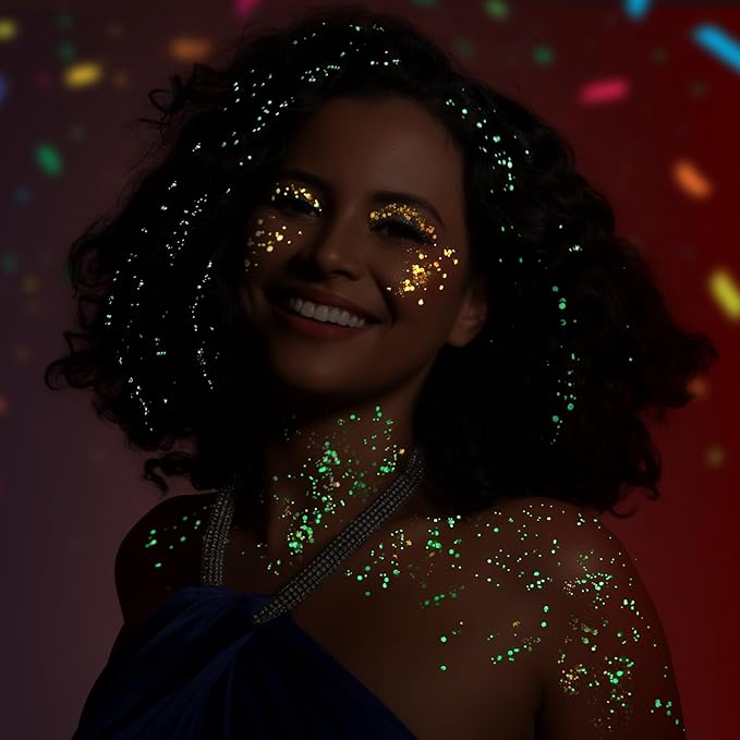 - Wide Application Body Glow: Express yourself with colors that pop vividly under black light and glow in the dark! Our chunky glitter can be applied to your body, face, nails, or hair, ensuring that you stand out at rave parties, glow party, music festivals or concerts