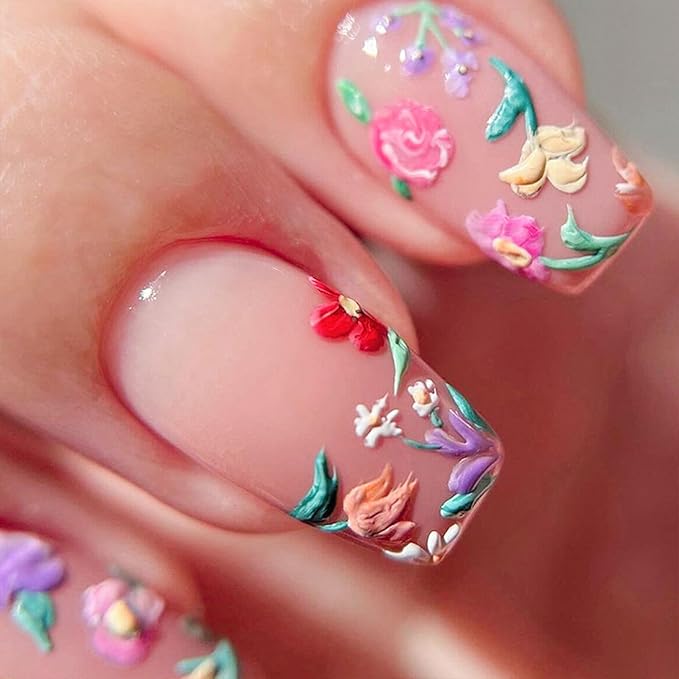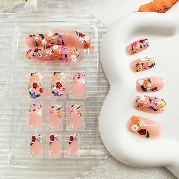 Flower Press on Nails Medium Cute Colorful 3D Flowers Fake Nails Square Acrylic Nails Press ons Colorful Floral Full Cover Glossy Spring and Summer Stick Glue on Nails for Women Girls 24 Pcs