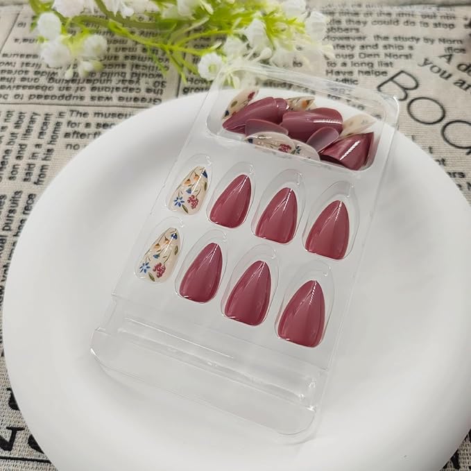 Flower Press on Nails Short Almond Fall Nails Press ons Short Fake Nails with Floral Design Glue on Nails Glossy Floral False Nails Reusable Full Cover Acrylic Stick on Nails for Women Girls 30 Pcs